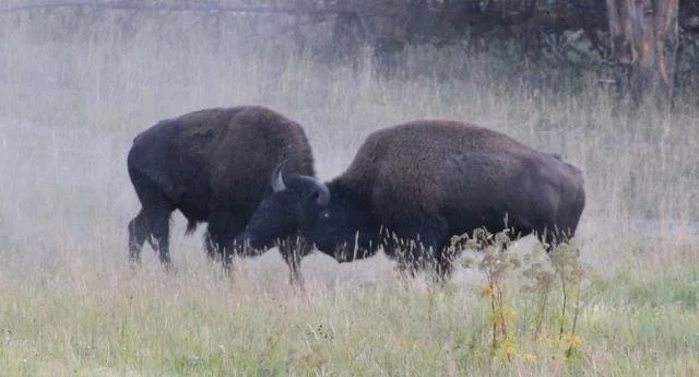 Last night, someone came up to me at the end of the dinner shift and asked if I had driven to work. I always drive at night because I’m scared of wildlife, and so I said yes. They asked for a ride because apparently there were hoards of Bison coming towards the hotel. It was true: when I got off last night, the basketball court, which is sort of like the Quad in front of the dorms, was covered with snorting bison. This morning, as I walked out to my car to go to work, there were at least 20 on the courts, just waking up. I hopped in my car and zoomed away. I’m not trying to piss off some horny horned animals. Not today!